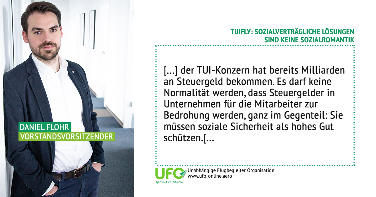 „Die Corona-Krise stellt die Reisebranche auf den Kopf und zerstört in atemberaubender Geschwindigkeit jahrelang aufgebaute Pläne von Unternehmen und Mitarbeitern. Nach dem Debakel um Lufthansa-Staatshilfen hat die Politik nun ihre nächste Bewährungsprobe, denn der TUI-Konzern hat bereits Milliarden an Steuergeld bekommen. Es darf keine Normalität werden, dass Steuergelder in Unternehmen für die Mitarbeiter zur Bedrohung werden, ganz im Gegenteil: Sie müssen soziale Sicherheit als hohes Gut schützen. Sozial verträgliche Lösungen sind keine Sozialromantik, sie müssen Normalität in unserer Wirtschaftsordnung sein“, appelliert Daniel Flohr, UFO-Vorsitzender an die Verantwortlichen in Unternehmen und Politik.