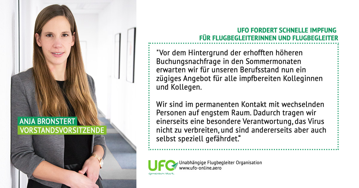 Die Unabhängige Flugbegleiter Organisation (UFO) fordert eine zeitnahe Impfung des Kabinenpersonals in Deutschland und schließt sich damit der Position des europäischen Dachverbandes EurECCA an.