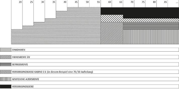 Die Grafik stellt beispielhaft und ohne Maßstabstreue einen von vielen möglichen Verläufen bei einem Vollzeitmitarbeiter, der mit 20 Jahren anfängt in der Kabine zu fliegen, Purser wird und mit 55 Jahren in die ÜV geht, dar.