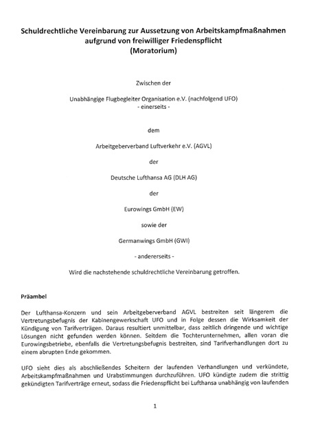 Hier ist die von UFO an den Lufthansa-Konzern übersandte Vereinbarung zu einem Arbeitskampf-Moratorium mit einer freiwilligen Friedenspflicht zu finden.