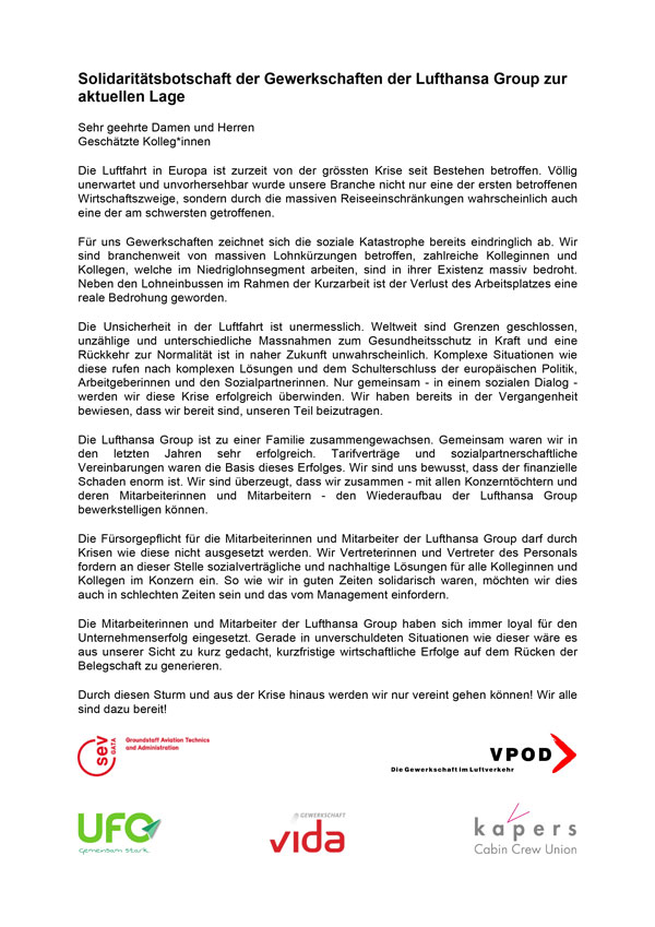 nachfolgend findet Ihr eine gemeinsame Erklärung unter anderem der drei Gewerkschaften, die die Flugbegleiter und Purser/Maître bei Swiss, AUA und den DLH Airlines in Deutschland vertreten. Sie geht an den Konzernvorstand.