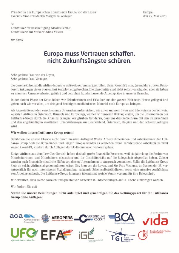 Offener Brief der Gewerkschaften im Lufthansa-Konzern an die verantwortlichen EU-Akteure.